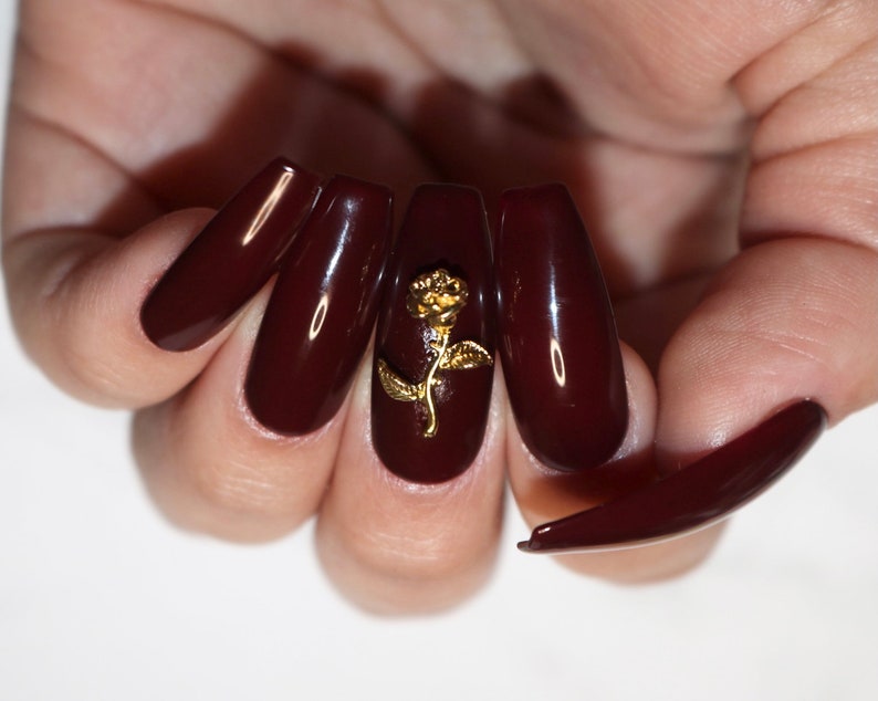 Bella Rosa Burgundy Nails With Gold Rose Press On Nails Etsy Canada